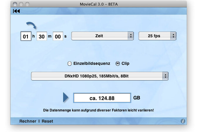 Berechnen sie benötigten Speicherplatz für Filmclips oder Einzelbildsequenzen. Die Längeneingabe ist in verschiedenster Form möglich (s.o.), bei der Ausgabe steht eine große Auswahl der gängigen Bildformate und Codecs zur Auswahl.